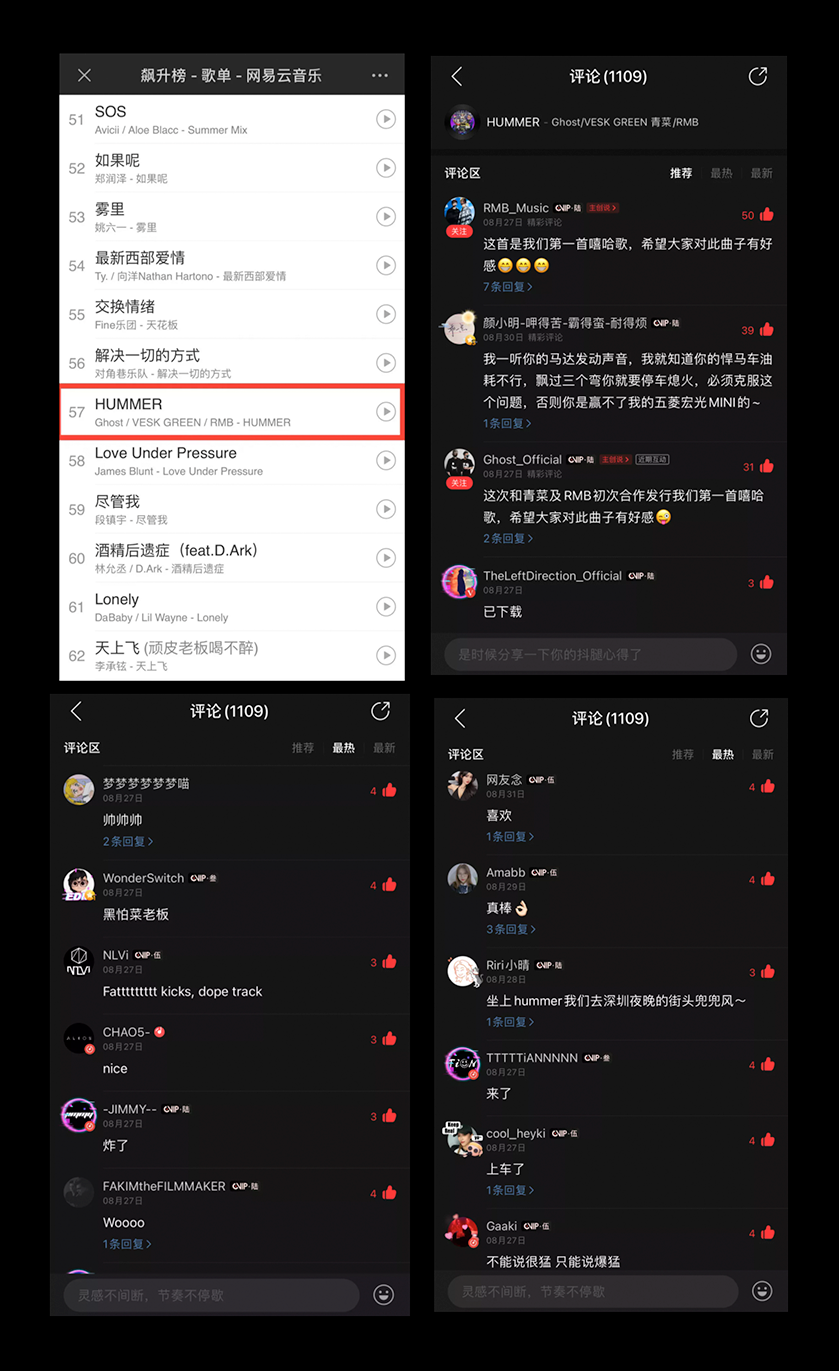 《Hummer》上线不足半个月,就已登上网易云音乐的飙升榜,目前歌曲评论已超过999+,收获一大批听众的好评与支持。
